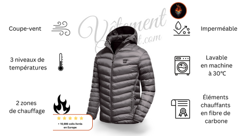 Cette veste chauffante est destinée aux personnes travaillant ou pratiquant des activités en extérieur, ainsi qu’aux sports d’hiver. Elle est durable et lavable en machine à 30 degrés, mais ne pas la mettre en bouchon et le séchage à l’air libre est conseillé.